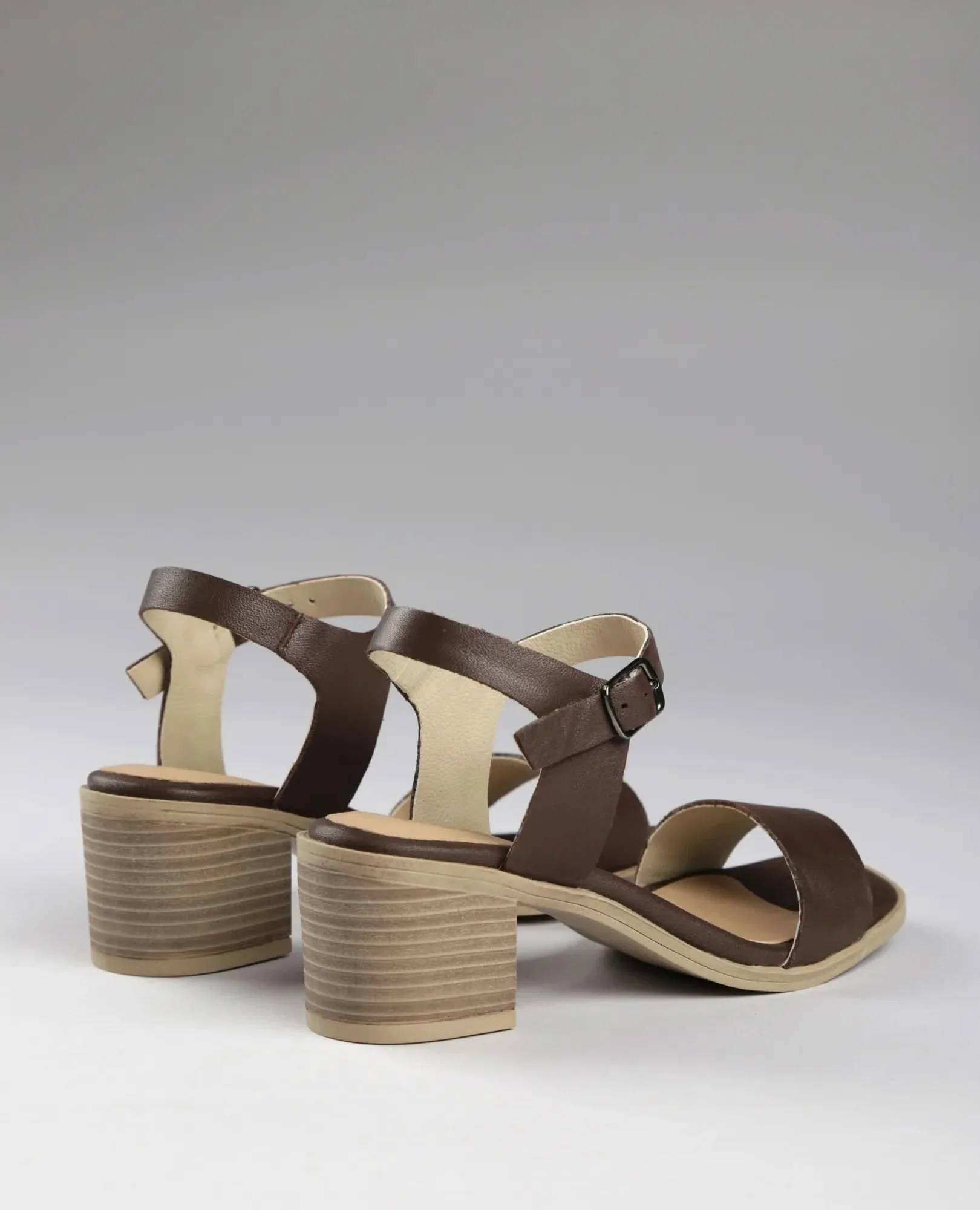סנדלי עקב קלאסיים מעור איכותי בעבודת יד, רצועה מקדימה ורצועת אבזם סביב הקרסול.
