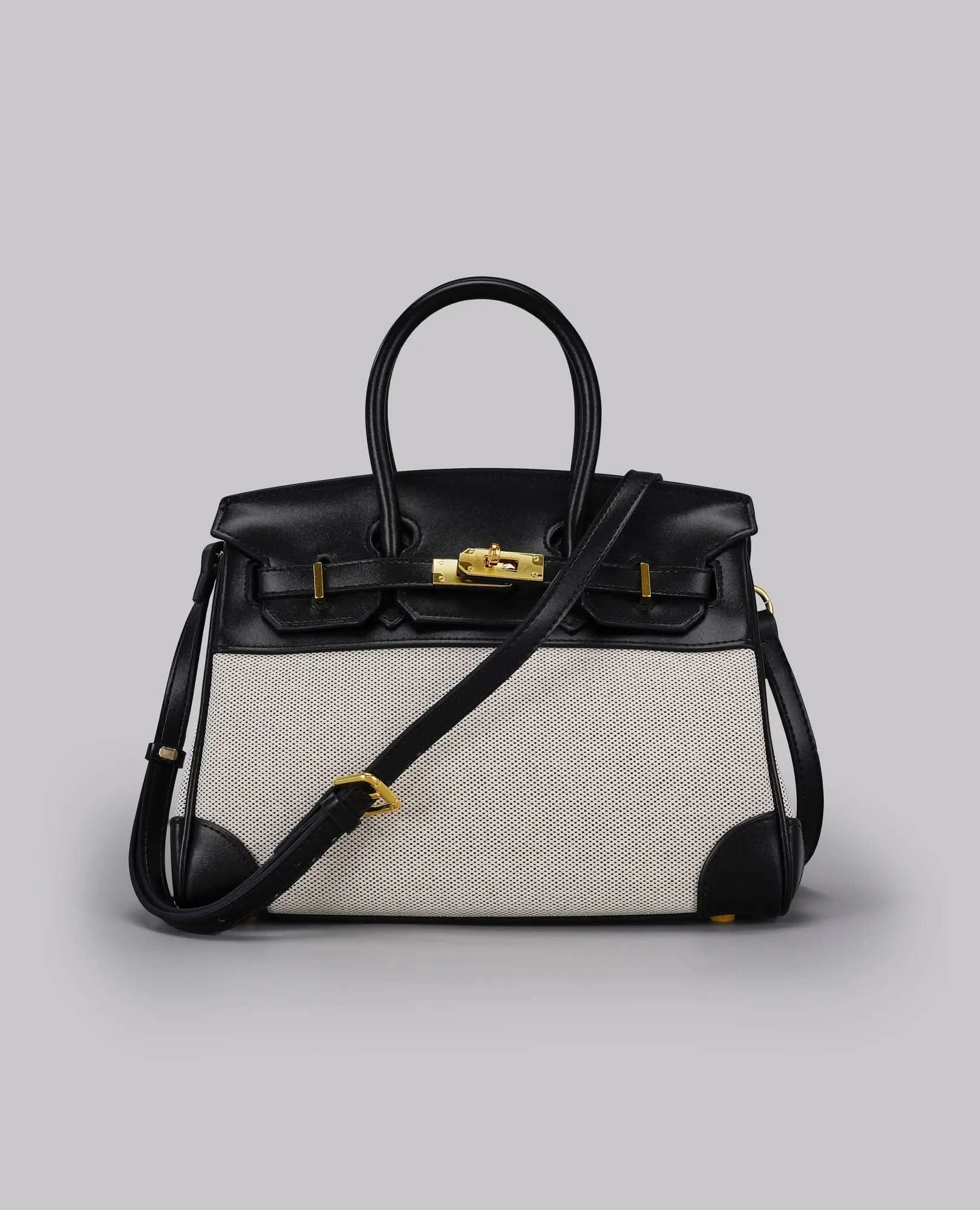 תיק צד קלאסי עם שילוב של בד קנבס ודמוי עור, שמעניק לו מראה אלגנטי עם טוויסט מודרני.