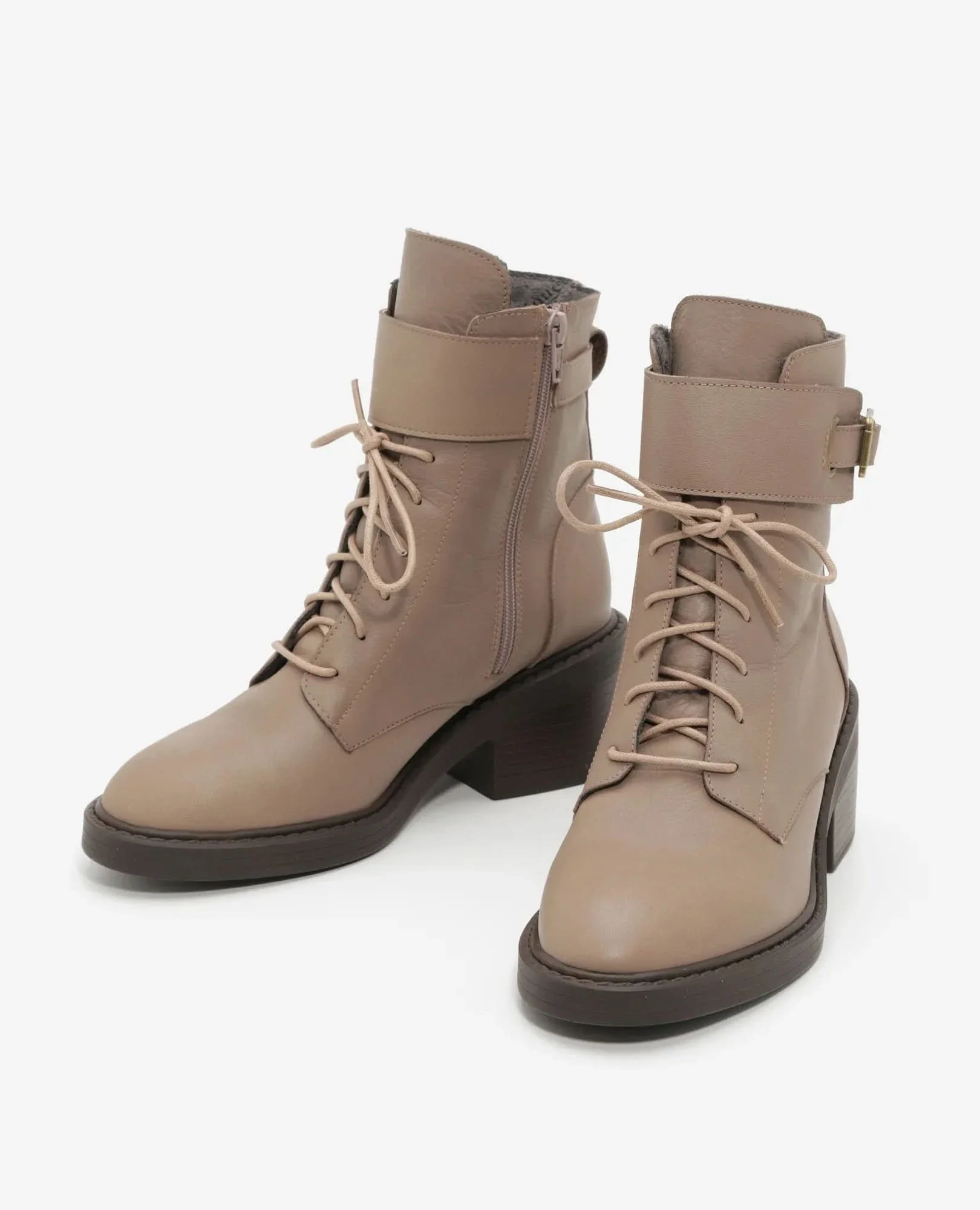 מגפוני עור בסגנון צבאי עם שרוכים ורצועת אבזם לעיטור. עקב צ'אנקי ופרונט מעוגל. עיצוב מוקפד שמבטיח נוחות וסטייל לאורך זמן, ואידאלי ליום יום.