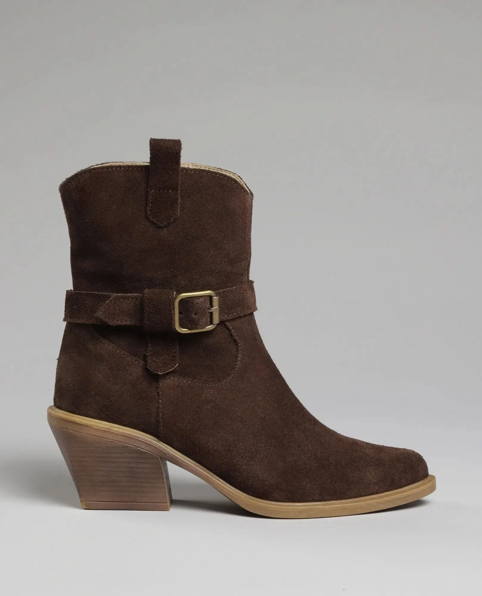 מגפוני עקב בסגנון בוקרים עם רצועת אבזם דקורטיבית, מוסיפים נוכחות ושיק ייחודי לכל הופעה.