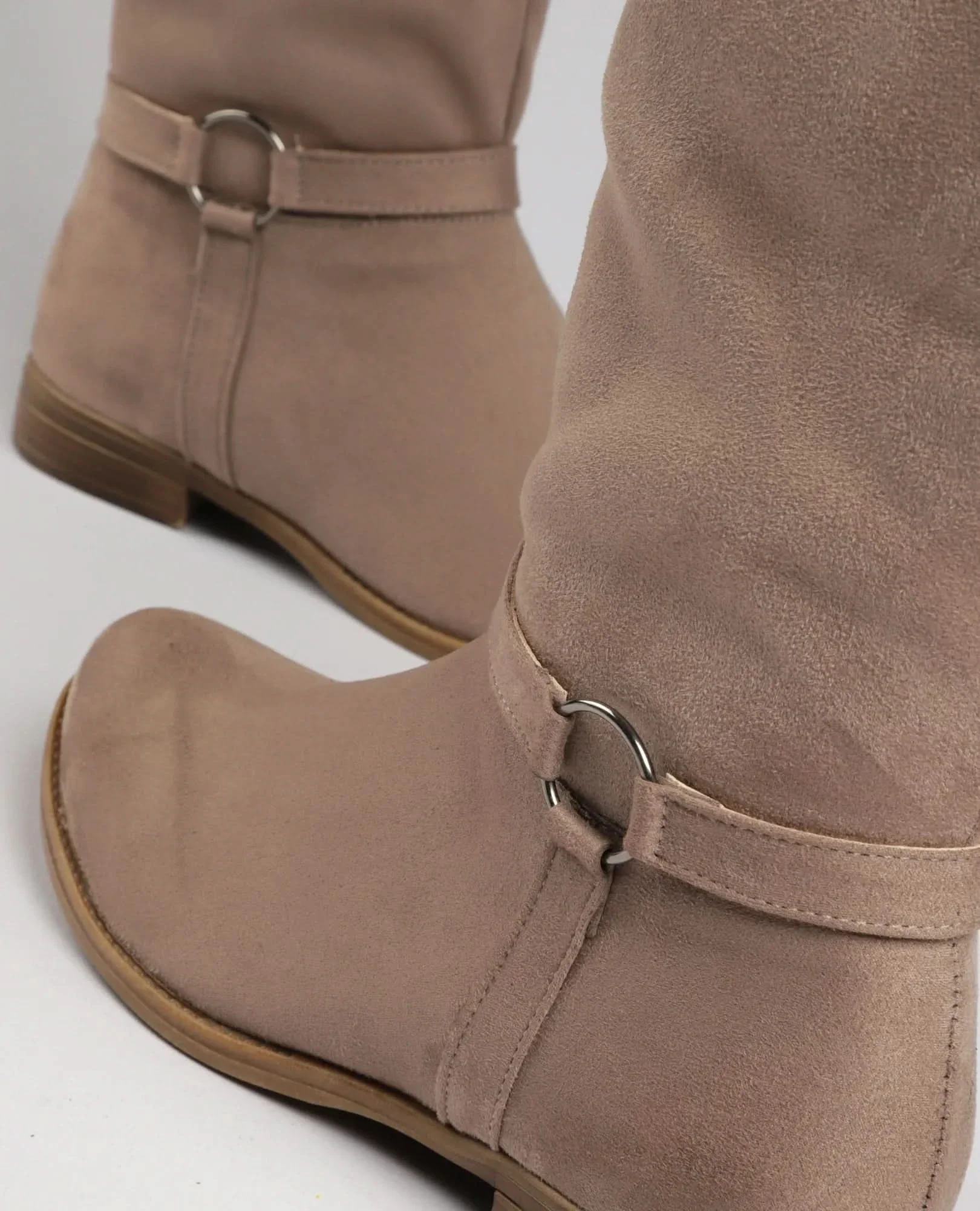 מגפיים שטוחים עם רצועה דקורטיבית וטבעת מתכת, שילוב שמכניס עניין מבלי להעמיס על המראה.
