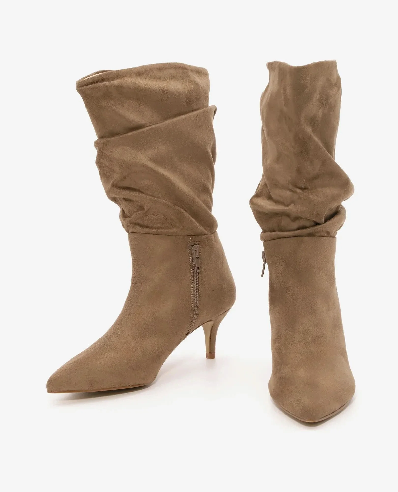 מגפי עקב אלגנטיים דמוי זמש, עם כיווצים ושפיץ בפרונט. פריט חגיגי שמקפיץ את הלוק ברגע.