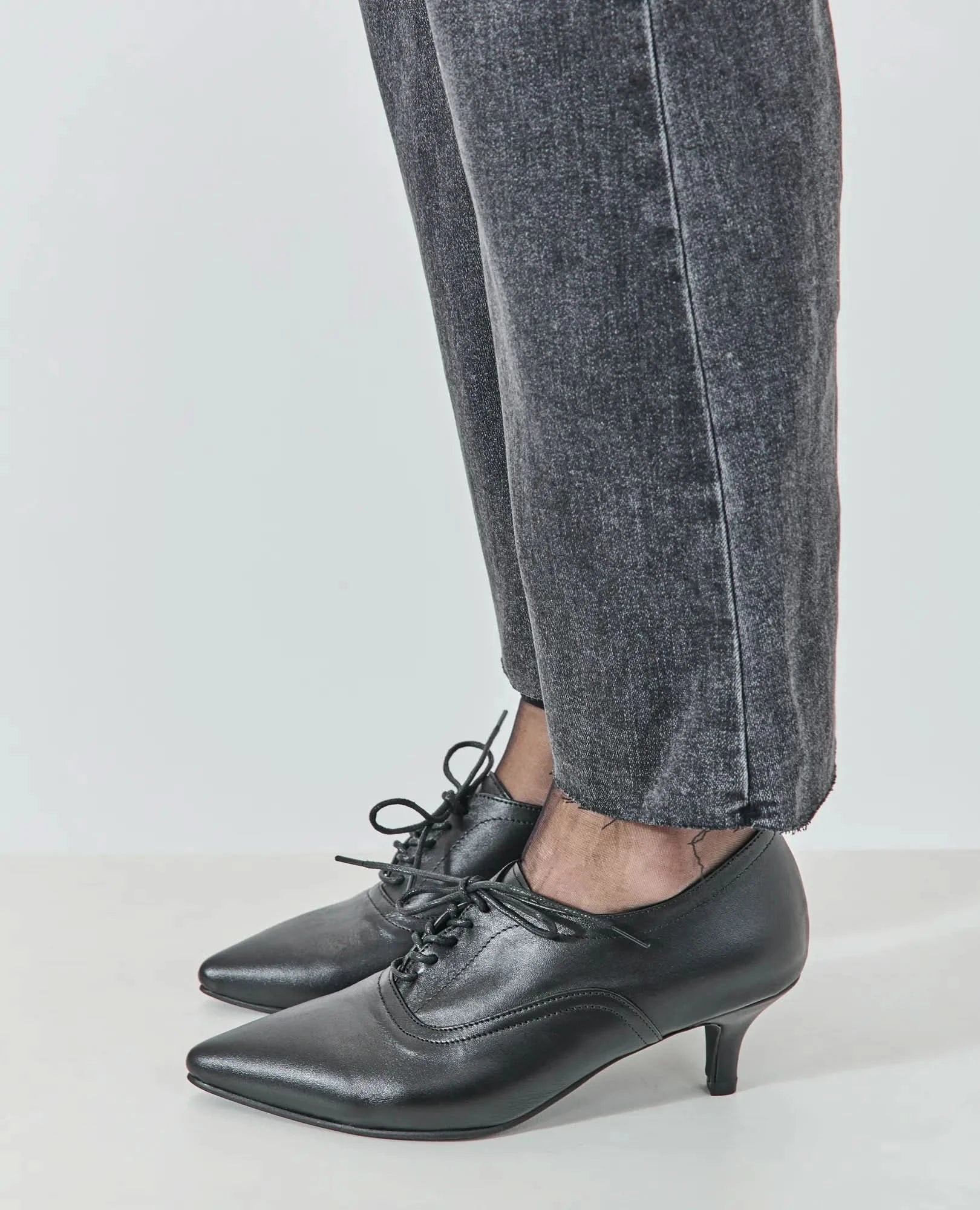 נעלי עקב בגזרת שפיץ עם שרוכים דקים, עשויות עור איכותי בגימור אלגנטי ומדויק.