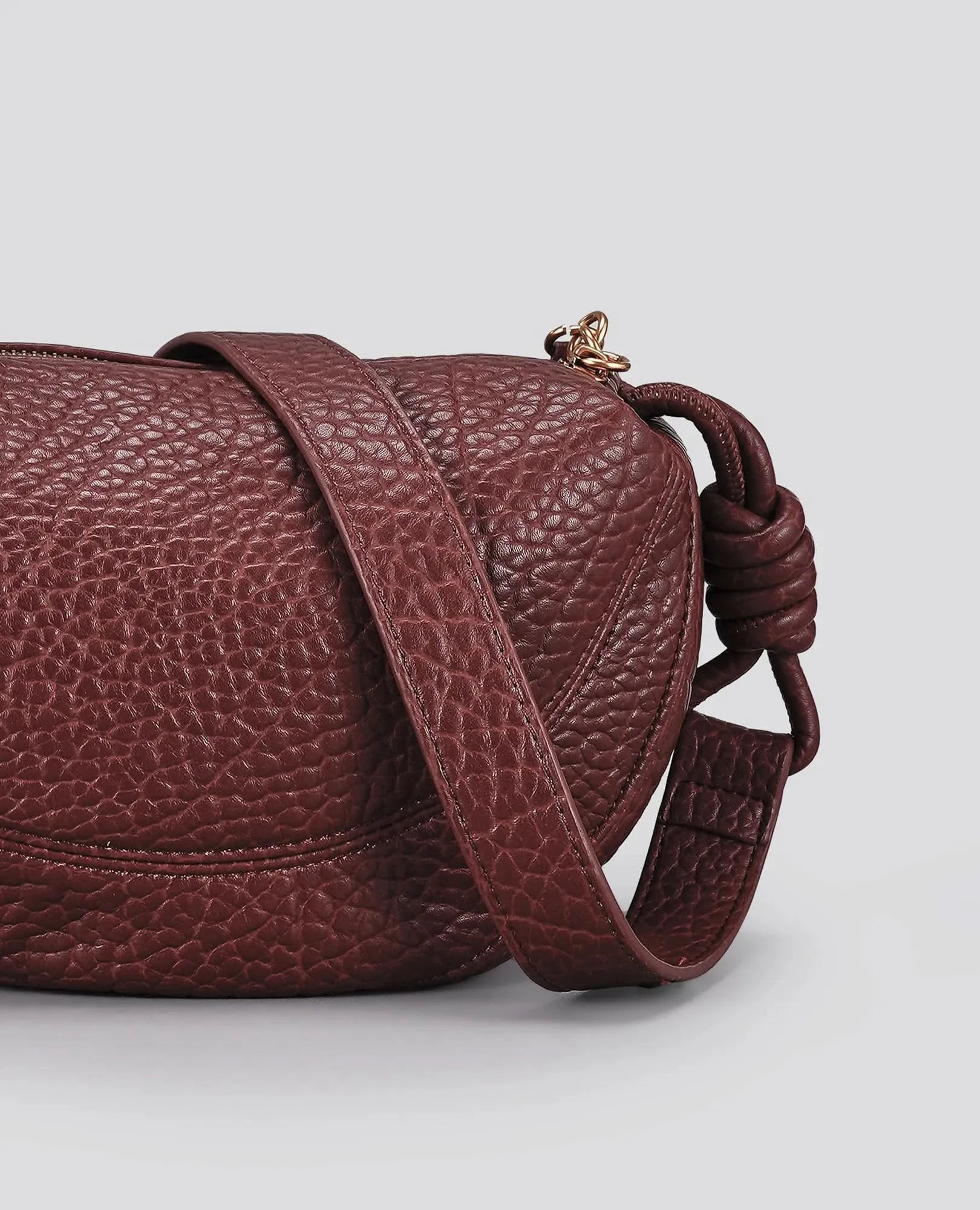 עשוי דמוי עור במרקם עדין, עם רצועה מתכווננת ופרטי קשירה מעוצבים בגוון זהב עדין.