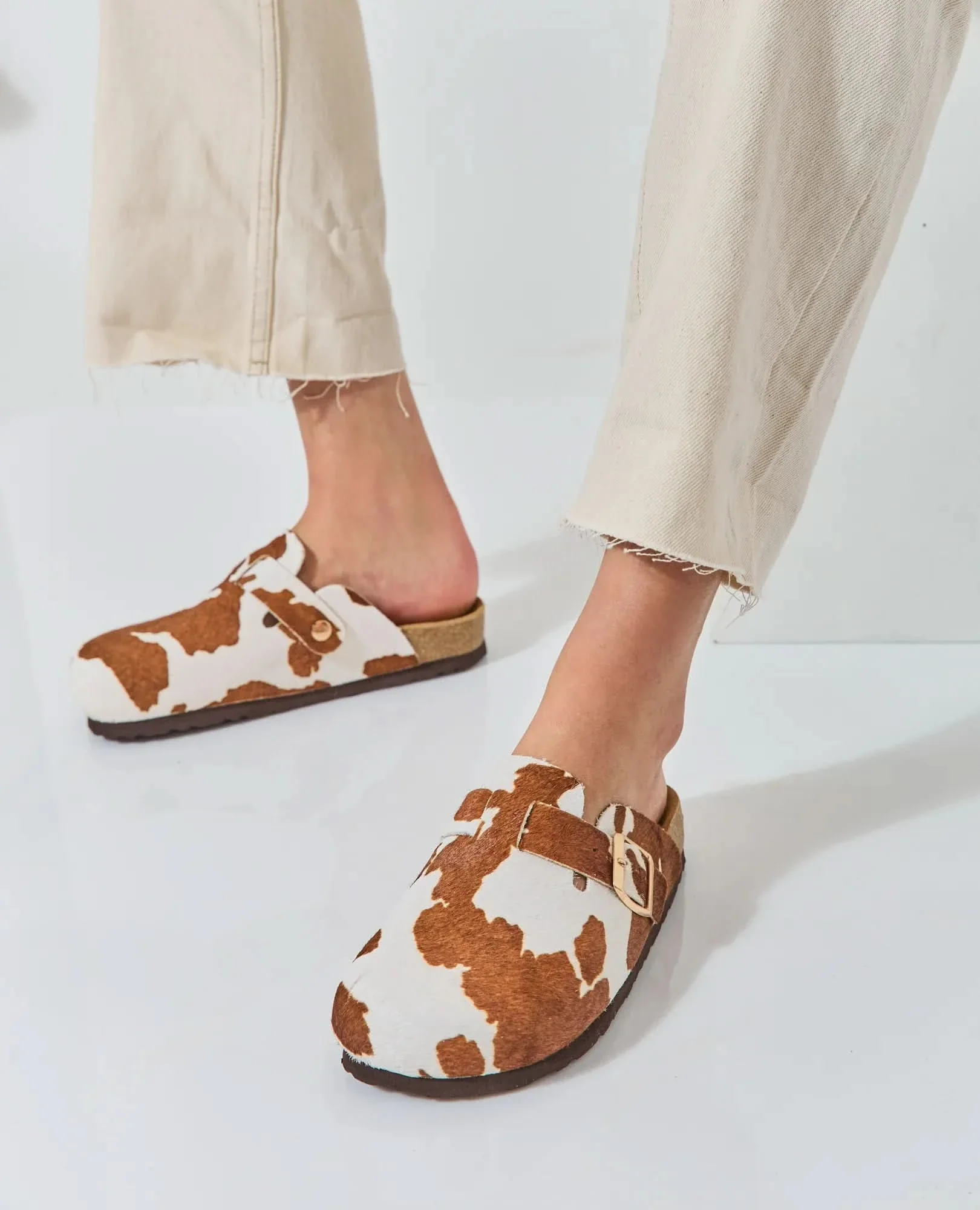 כפכפים סגורים מעור איכותי בגזרה עגולה עם הדפס פרה ייחודי שמכניס קריצה שובבה למראה החורפי.